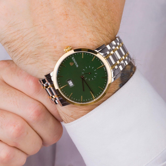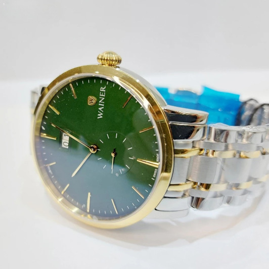Корпус: Круглый корпус из нержавеющей стали 316L с частичным PVD покрытием. Циферблат зелёного цвета, защищен устойчивым к царапинам сапфировым стеклом и украшен фирменным логотипом Wainer. Тонкие заостренные прямоугольные стрелки. Метки в виде штрихов. Рифленая заводная головка. Диаметр корпуса 44 мм. Водонепроницаемость 50 метров.