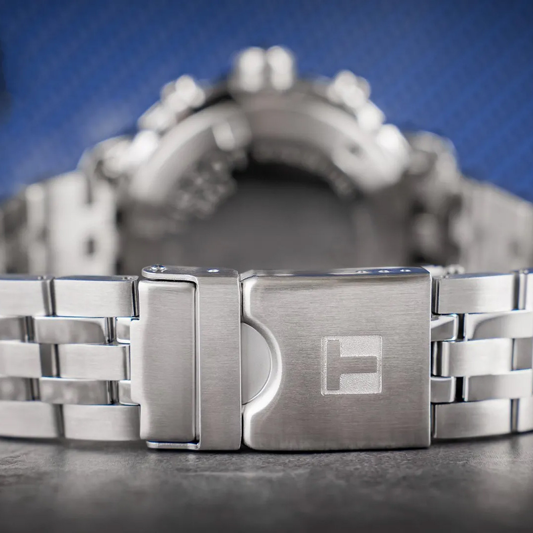 Ремешок: Браслет выполнен из высококачественной стали 316L с повышенной устойчивостью к коррозии, поверхность с матовой шлифовкой – сатинированием и полировкой до зеркального блеска, раскладывающаяся застёжка с предохранительными кнопками и дайверским удлинением.