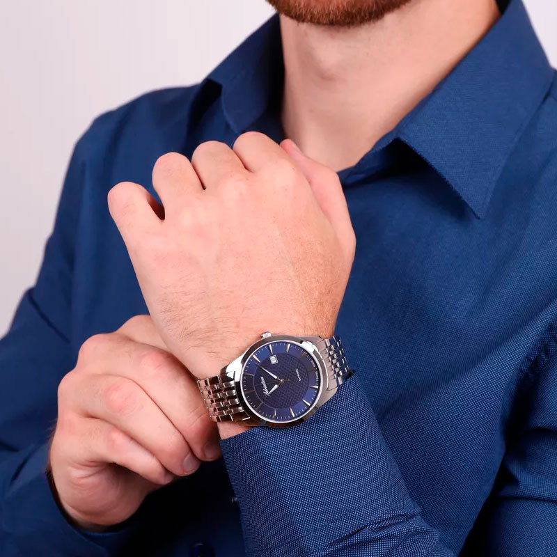 Корпус: Круглый корпус выполнен из полированной нержавеющей стали. Синий циферблат с узором гильоше. Накладные часовые индексы выполненый из стали. Стрелки с покрытием SuperLuminova, которое обеспечивает длительную подсветку в темное время суток. Устойчивое к возникновению царапин сапфировое стекло. Диаметр корпуса составляет 40 мм, толщина 7 мм. Водостойкость WR 50 (мытье рук, дождь).