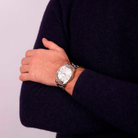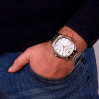 Корпус: Круглый корпус выполнен из полированной нержавеющей стали с частичным PVD покрытием желтого золота. Серебристый циферблат с узором гильоше. Метки в виде штрихов и римской цифры 12. Стрелки с покрытием SuperLuminova, которое обеспечивает длительную подсветку в темное время суток. Устойчивое к возникновению царапин сапфировое стекло. Заводная головка с защитой. Диаметр корпуса составляет 45 мм, толщина 9 мм. Водостойкость WR 50 (мытье рук, дождь).