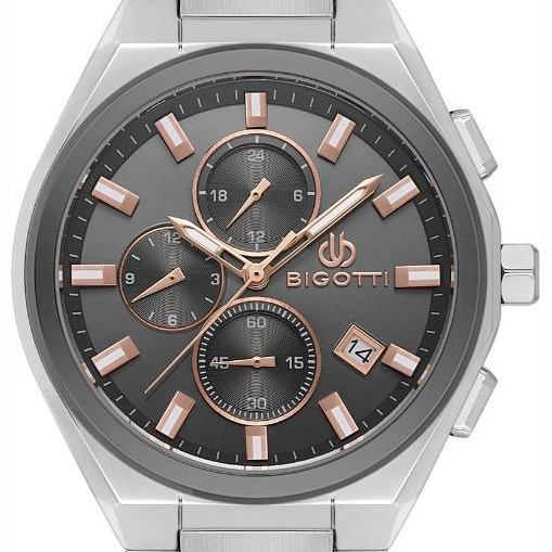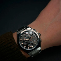 Функции: Индикация часов, минут и секунд при помощи центральных стрелок. Часы с отображением второго часового пояса, дня недели и текущего времени в 24-х часовом формате на малых циферблатах. Присутствует окошко даты.