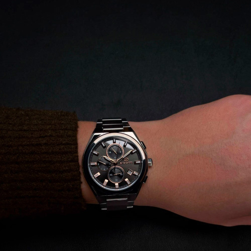 Корпус: Корпус изготовлен из латуни и имеет надёжное износостойкое покрытие серебристого цвета. Циферблат серого цвета выполнен по технологии Sunray (солнечные лучи). Позолоченные часовые индексы и стрелки с люминесцентным покрытием. Прочное минеральное стекло обеспечит защиту часов от повреждений. Диаметр: 44 мм. Водонепроницаемость: 50 м.