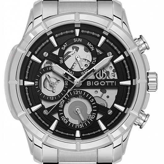 Функции: Индикация часов, минут и секунд при помощи центральных стрелок. На малых циферблатах отображается дата, день недели и текущее время в 24-х часовом формате.