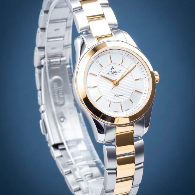 Корпус: Корпус выполнен из высококачественной стали с повышенной устойчивостью к коррозии с частичным PVD покрытием. Металлик циферблат в центральной части с гильошированным узором, украшенный кристаллами. Позолоченные полированные стрелки и часовые индексы. Сапфировое стекло устойчивое к появлению царапин, обладающее высокой прозрачностью. Диаметр: 28,5 мм. Водозащита: 30 м.