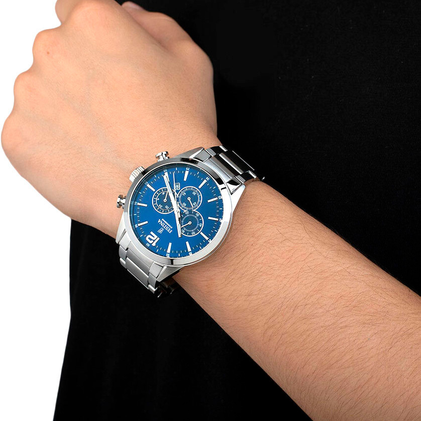 Корпус: Корпус часов изготовлен из нержавеющей стали. Циферблат синего цвета, выполнен по технологии Sunray (солнечные лучи) и метками в виде штрихов. Стрелки с люминесцентным покрытием. Минеральное стекло. Рифленая заводная головка с защитой. Габаритные размеры: D 43,5мм, толщина 10,6мм. Водонепроницаемость: 50 м.
