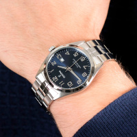 Корпус: Ударопрочный корпус часов сделан из нержавеющей стали. Циферблат выполнен по технологии Sunray (солнечные лучи) синего цвета с серебристыми стрелками и часовыми индексами в виде арабских цифр. Часовая и минутная стрелки с нанесенным люминесцентным покрытием, которое светится в темноте после непродолжительной зарядки на свету. Минеральное стекло. Рифленая заводная головка с защитой. Диаметр: 40 мм. Водонепроницаемость: 100 м.