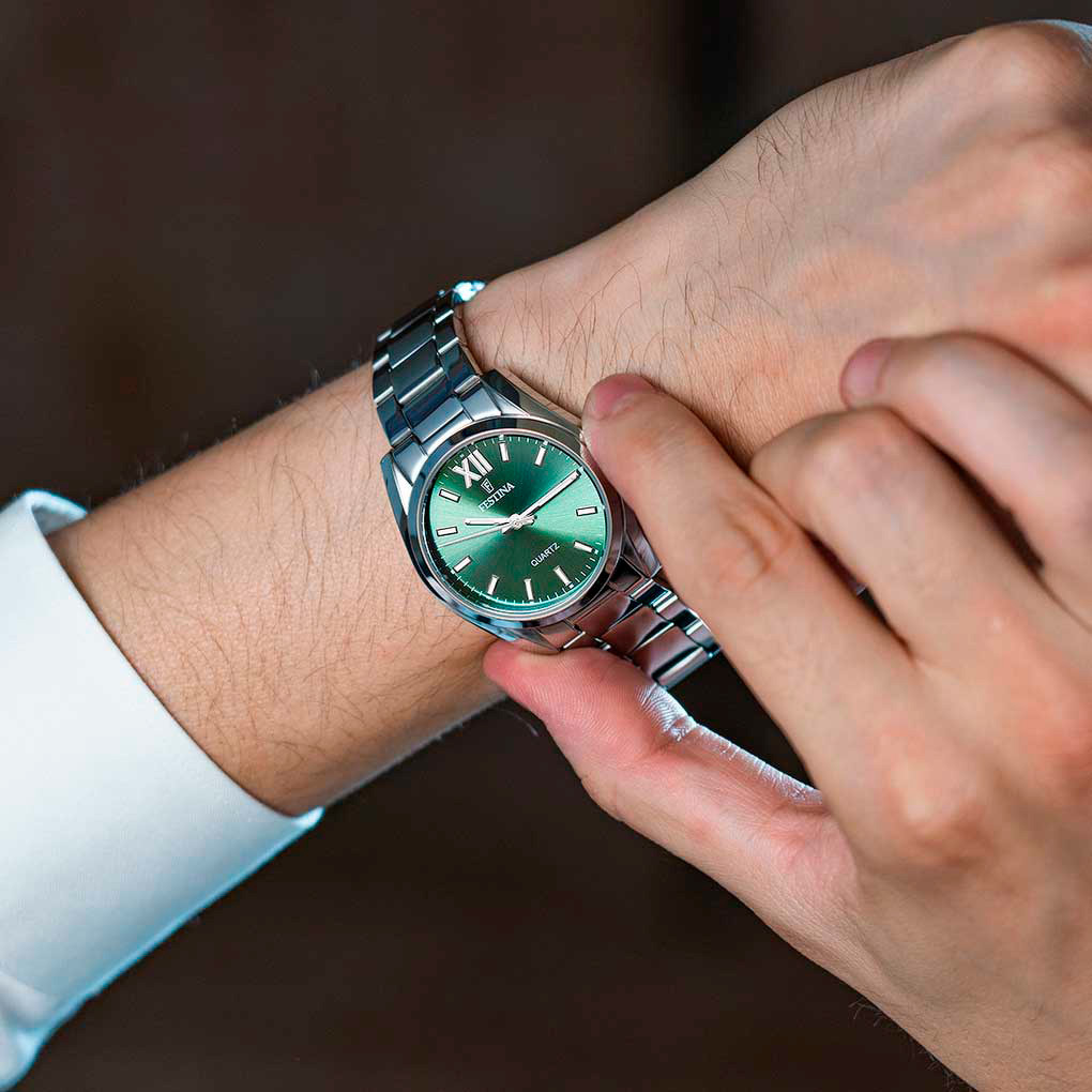 Ремешок: Стальной браслет с раскладывающейся застежкой, которая украшена фирменным логотипом Festina.