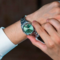 Корпус: Ударопрочный корпус часов сделан из нержавеющей стали. Зелёный циферблат. Минеральное стекло. Диаметр: 37 мм. Водонепроницаемость: 50 м.