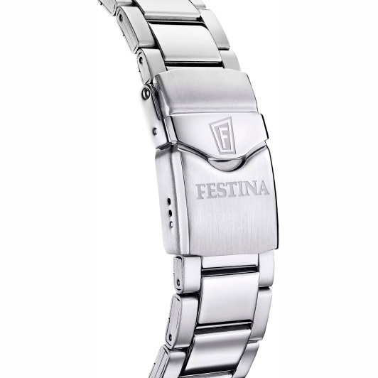Ремешок: Надежный стальной браслет с раскладывающейся застежкой и фиксатором, украшена фирменным логотипом Festina.