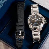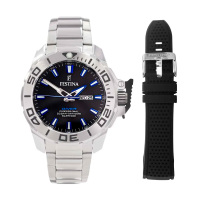 Корпус: Ударопрочный корпус часов сделан из нержавеющей стали. Однонаправленный вращающийся безель из нержавеющей стали. Чёрный циферблат со стрелками и часовыми индексами в виде штрихов с нанесенным люминесцентным покрытием, которое светится в темноте после непродолжительной зарядки на свету. Сапфировое стекло устойчивое к возникновению царапин. Завинчивающаяся заводная головка с защитой. Диаметр: 46 мм. Водонепроницаемость: 200 м.