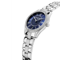 Корпус: Корпус из нержавеющей стали марки 316L, декорирован бриллиантами по безелю. Темно-синий циферблат с гильошированным декором, набивными римскими цифрами и белыми стальными стрелками. Устойчивое к возникновению царапин сапфировое стекло. Диаметр: 36 мм. Водозащита: 50 м.