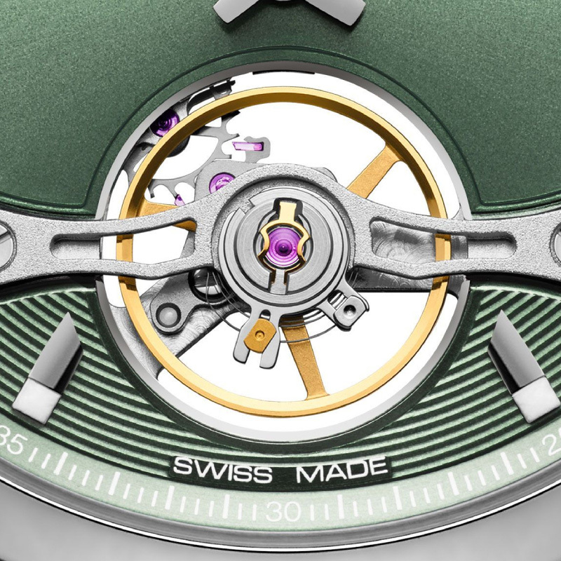Механизм: Швейцарский механизм с автоподзаводом, калибр RW1212, с запасом хода 38 часов и частотой 28 800 пк/час. Видимая со стороны циферблата работа анкерного спуска и колебания балансового колеса. Частично скелетонизированные мосты и платина механизма.