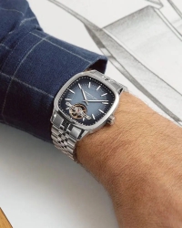 Корпус: Корпус квадратной формы выполнен из нержавеющей стали марки 316L с матовой шлифовкой и глянцевой полировкой.Градиентный циферблат синего цвета с открытым балансом хода. Люминесцентное покрытие Super-Luminova®, светящееся в темноте, нанесено на стрелки и разметку циферблата. Сапфировое стекло имеет повышенную устойчивость к возникновению царапин. Антибликовое покрытие нанесенное с обеих сторон стекла. Задняя крышка с прозрачным окном из сапфирового стекла имеет резьбовое соединение с корпусом. Завинчивающаяся заводная коронка с монограммой RW. Размер корпуса 40х40мм, толщина 10,5мм. Водостойкость на глубине до 100 метров (10 бар/АТМ).