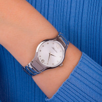 Корпус: Круглый корпус выполнен из полированной нержавеющей стали. Серебристый циферблат с узором гильоше, украшен 10 кристаллами. Накладные часовые индексы выполнены из стали. Минеральное стекло. Диаметр корпуса составляет 33 мм, толщина 7 мм. Водостойкость WR 30 (мытье рук, дождь).