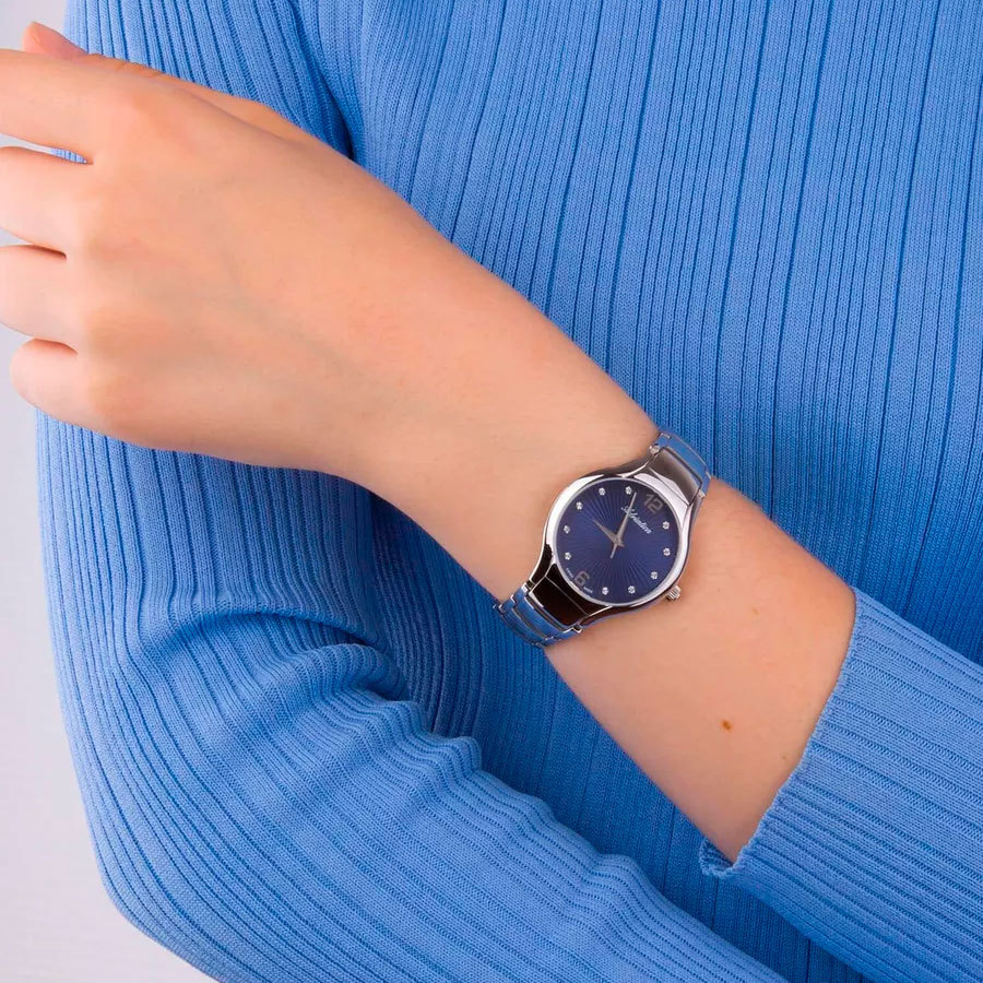 Корпус: Круглый корпус выполнен из полированной нержавеющей стали. Циферблат синего цвета украшен 10 цирконами. Сапфировое стекло, устойчивое к царапинам. Диаметр корпуса составляет 33 мм, толщина 7 мм. Водостойкость WR 30 (мытье рук, дождь).