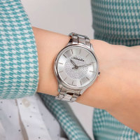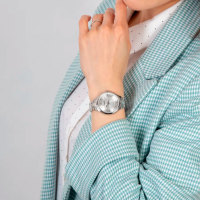 Корпус: Круглый корпус выполнен из полированной нержавеющей стали. Циферблат серебристого цвета с метками в виде штрихов, украшен фианитами. Минеральное стекло с сапфировым покрытием. Диаметр корпуса составляет 34 мм, толщина 8 мм. Водостойкость WR 30 (мытье рук, дождь).