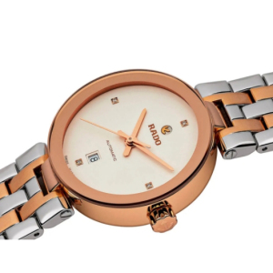 Корпус: Нержавеющая сталь с частичным PVD-покрытием розового золота. Металлик циферблат с золотистыми стрелками и часовыми индексами, декорирован 4 бриллиантами. Сапфировое стекло. Диаметр 28 мм. Водонепроницаемость 30 метров.