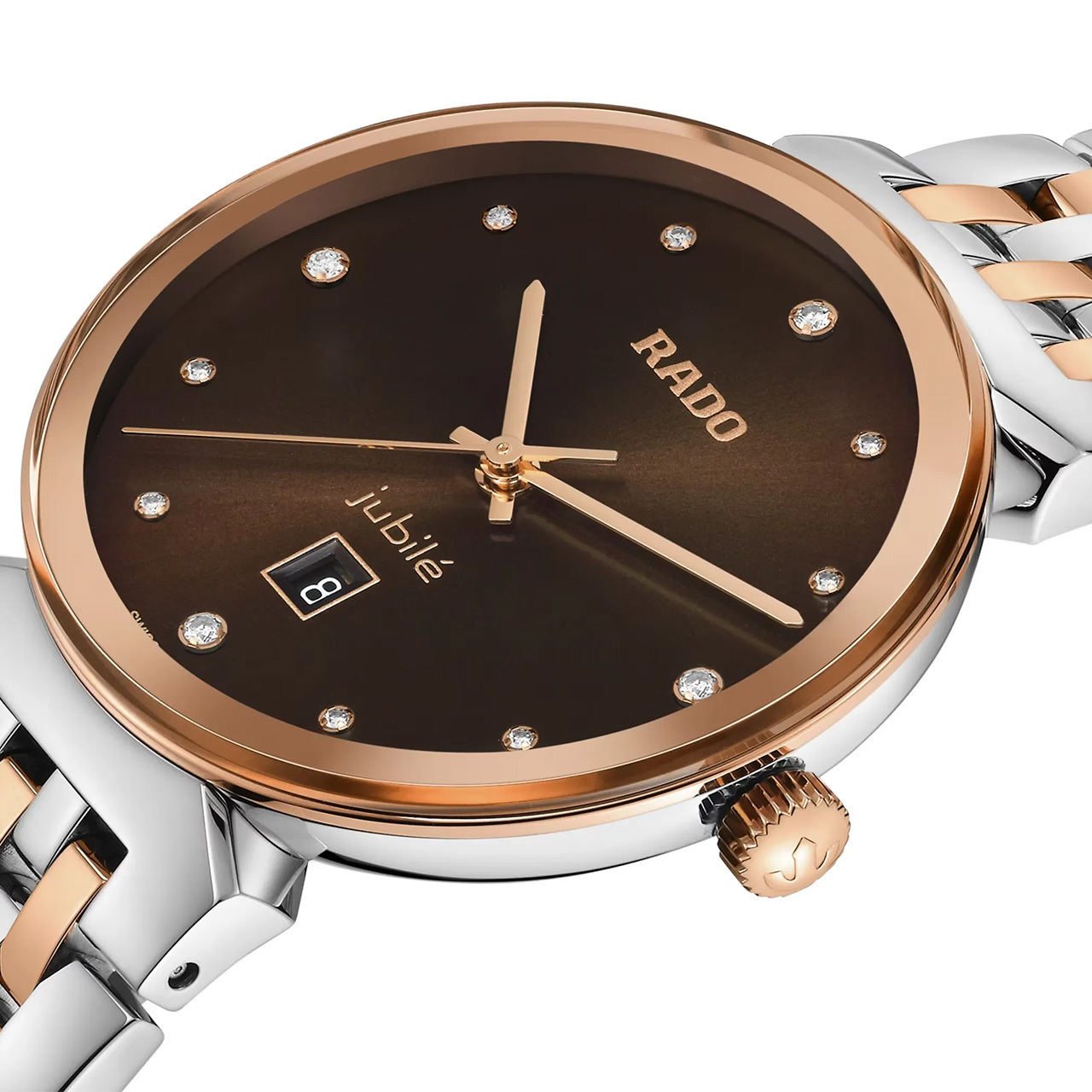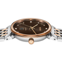 Корпус: Нержавеющая сталь с частичным PVD-покрытием розового золота. Коричневый циферблат с золотистыми стрелками и часовыми индексами, декорирован 12 бриллиантами. Инновационное металлизированное сапфировое стекло. Рифленая заводная головка. Диаметр 30 мм. Водонепроницаемость 50 метров.