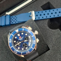 Корпус: Корпус выполнен из нержавеющей стали AISI 304, что придает часам особую прочность и стойкость от повреждений. Циферблат синий, который дополняет однонаправленный вращающийся безель. Контрастные метки и стрелки покрыты люминесцентным покрытием для лучшей видимости в темноте. Закаленное минеральное стекло Hardlex разработанное компанией Seiko Watch Corporation, которое обладает высокой устойчивостью к ударам и царапинам. Диаметр 45 мм. Водозащита 20 бар (200 метров).