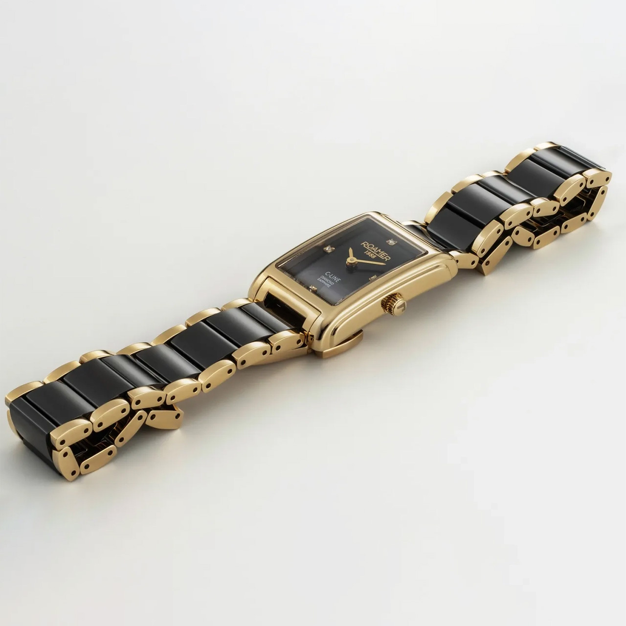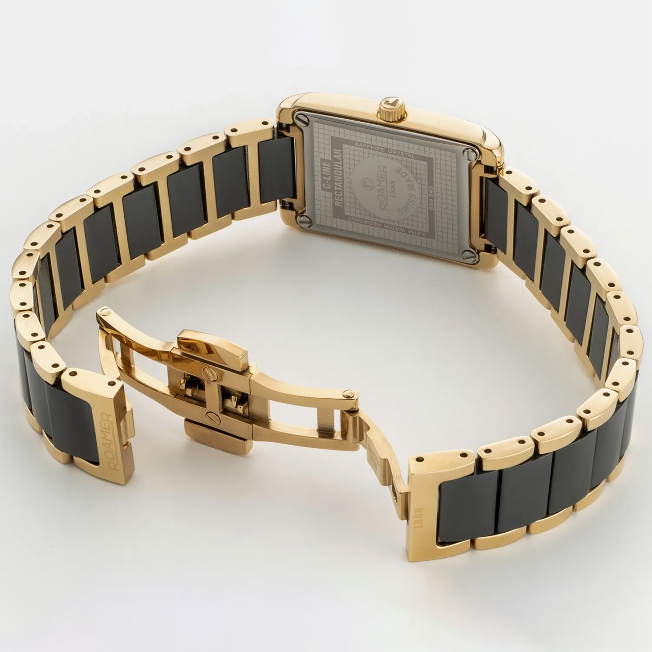 Ремешок: Браслет из полированной нержавеющей стали с PVD-покрытием и черными высокотехнологичными керамическими средними звеньями. Раскладывающаяся застежка на фиксации.