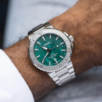Коллекция: Bracenet Aquis Automatic. Новое сотрудничество Oris с Bracenet поддерживает миссию экологического предприятия по защите морей. Эти часы Aquis с калейдоскопическим зеленым циферблатом, выполненным из переработанных рыболовных сетей. Каждый циферблат уникален благодаря случайному процессу. В результате получился циферблат, вдохновлённый океаном, - ежедневное напоминание о вашем вкладе в сохранение океана.