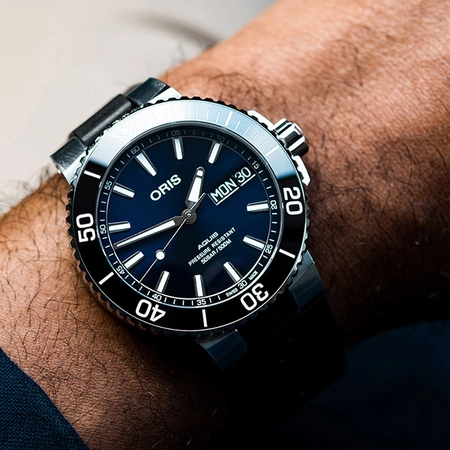 Корпус: Многокомпонентный корпус из нержавеющей стали, керамический ободок чёрного цвета с минутной шкалой. Сапфировое стекло, выпуклое с внутренним антибликовым покрытием. Синий циферблат Sunray, стрелки и накладные часовые метки с родиевым покрытием и белым Superluminova. Завинчивающаяся задняя крышка со специальной гравировкой. Завинчивающаяся заводная головка из нержавеющей стали. Диаметр 45,5 мм. Водонепроницаемость 500 метров.