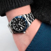 Корпус: Корпус выполнен из высококачественной стали с повышенной устойчивостью к коррозии, поверхности с матовой шлифовкой – сатинированием и полировкой до зеркального блеска с частичным PVD покрытием синего цвета. Однонаправленный безель вращается со щелчками в направлении против хода стрелок. Циферблат чёрного цвета. Люминесцентный состав на стрелках и на разметке циферблата. Сапфировое стекло, это лучшее стекло для наручных часов, которое не царапается при механическом воздействии, его можно повредить только алмазом. Диаметр корпуса: 42 мм. Водозащита до 100 метров позволит плавать.