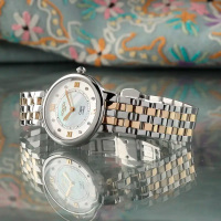 Корпус: Нержавеющая сталь. Белый циферблат декорирован натуральным перламутром и бриллиантами на часовых метках. Золотистые стрелки и римские цифры. Сапфировое стекло с антибликовым покрытием. Водонепроницаемость 50 метров. Диаметр 30 мм.