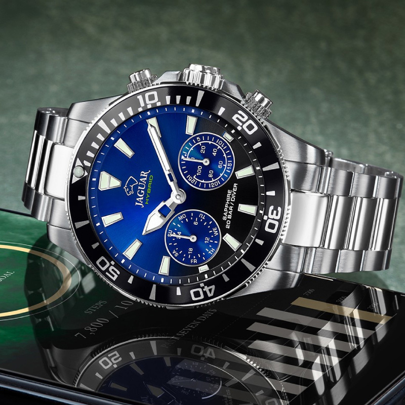 Механизм: Кварцевый гибридный механизм швейцарского производства со Смарт-Модулем. Данный тип механизма обеспечивает возможность подключить часы к телефону через Bluetooth и управлять большим рядом дополнительных функций на выбор с помошью приложения Jaguar.
