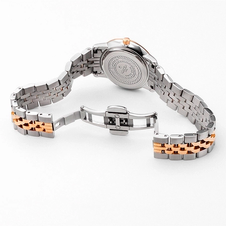 Ремешок: Браслет из высококачественной нержавеющей стали с повышенной устойчивостью к коррозии, поверхности с матовой шлифовкой – сатинированием и полировкой до зеркального блеска с частичным IP покрытием из розового золота. Раскладывающаяся стальная застежка "бабочка" .