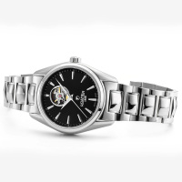 Функции: Индикация часов, минут и секунд при помощи центральных стрелок. Дата в положении "3 часа". Вырез под стрелкой "12 часов" позволяет незаметно заглянуть в сердце швейцарского механизма Soprod P24OH .