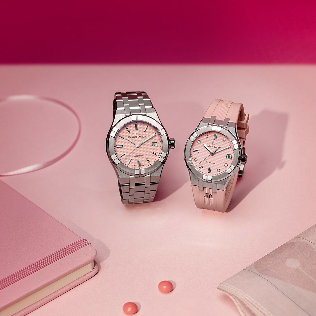 Ремешок: Модель с браслетом из нержавеющей стали с литыми звеньями в пять рядов, система быстрой замены ремешка/браслета, браслетная застежка с тройным сложением – «бабочка», раскладывающаяся при нажатии кнопок двойной блокировки, гравировка Maurice Lacroix. Часы в комплекте с розовым ремешком из натурального каучука с тиснением, классическая застежка пряжка.