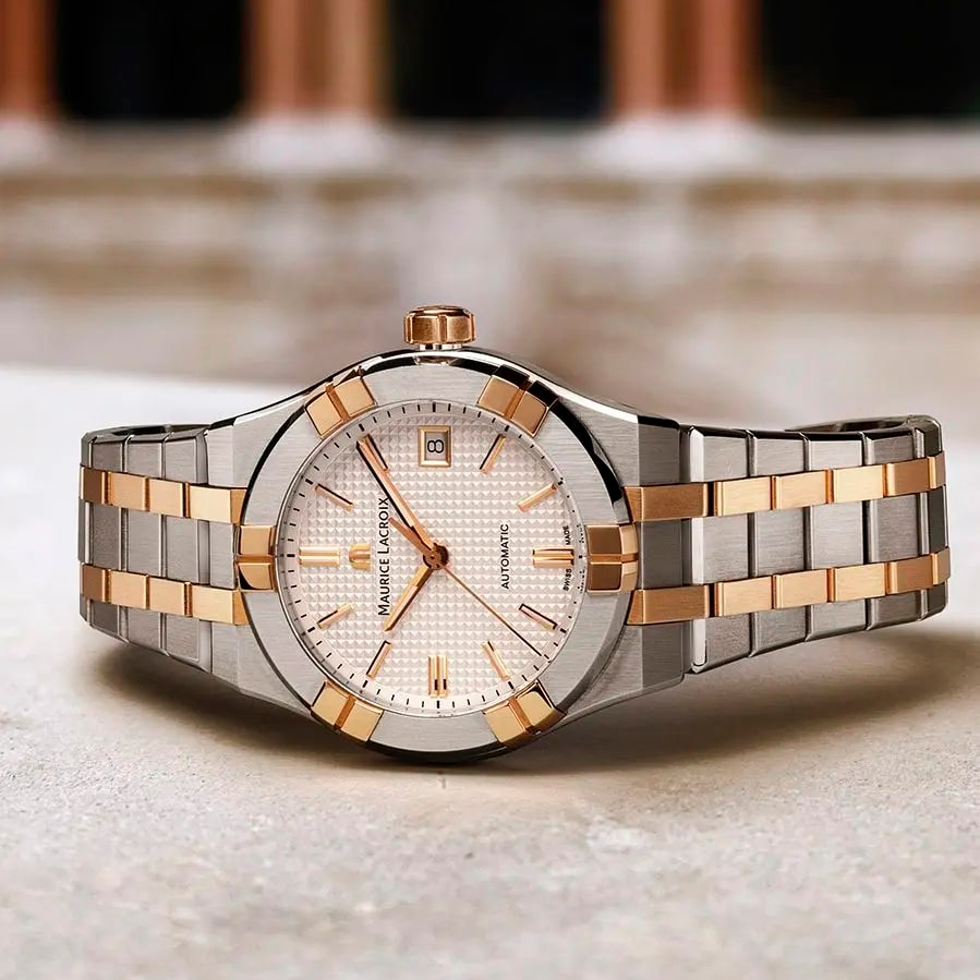 Ремешок: Браслет из нержавеющей стали с литыми звеньями в пять рядов, два центральных ряда с золотым покрытием, система быстрой замены ремешка/браслета, браслетная застежка с тройным сложением – «бабочка», раскладывающаяся при нажатии кнопок двойной блокировки, гравировка Maurice Lacroix.