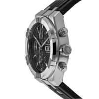Корпус: Круглый корпус выполнен из нержавеющей стали 316L, поверхность с матовой шлифовкой сатинированием и глянцевой полировкой до зеркального блеска. Циферблат глубокого черного цвета с гильошированием в стиле «клетка», вспомогательные индикаторы хронографа с гильошированием в виде концентрических кругов. Аппликация часовых индексов и стрелки с алмазной огранкой имеют родиевое покрытие и полировку до зеркального блеска с люминесцентным покрытием Super-Luminova, которое светится в темноте после непродолжительной зарядки на свету. Сапфировое стекло с антибликовым покрытием защищает циферблат от царапин и обеспечивает отличную читаемость при любом освещении. Завинчивающаяся заводная головка с фирменным логотипом. Диаметр корпуса составляет: 44 мм. Водостойкость: 20 ATM.
