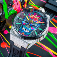 Коллекция: TULUM SKULL Это оживший холст художника-татуировщика. Череп Тулума напоминает нам о Дне Мертвых, Dia de los Muertos, где яркий череп важный элемент празднования. На стальном корпусе часов выгравированы листья "древа жизни", соединяющего мир мертвых с миром живых. Лимитированная серия: ONE OF 100.