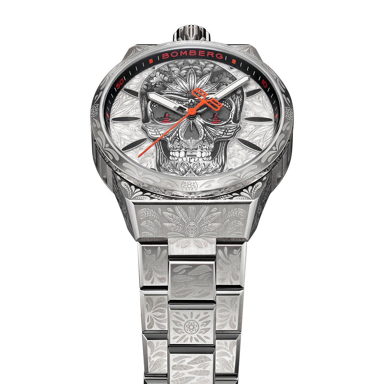 Корпус: Круглый стальной корпус марки 316L украшены лазерной гравировкой. Серебристый циферблат с метками в виде штрихов украшен гравировкой и большим черепом. Мечевидные стрелки с люминесцентным покрытием(Super-LumiNova). Сапфировое стекло с антибликовым покрытием. Завинчивающаяся заводная головка на 12ч. Диаметр: 43 мм. Водозащита: 100 м.