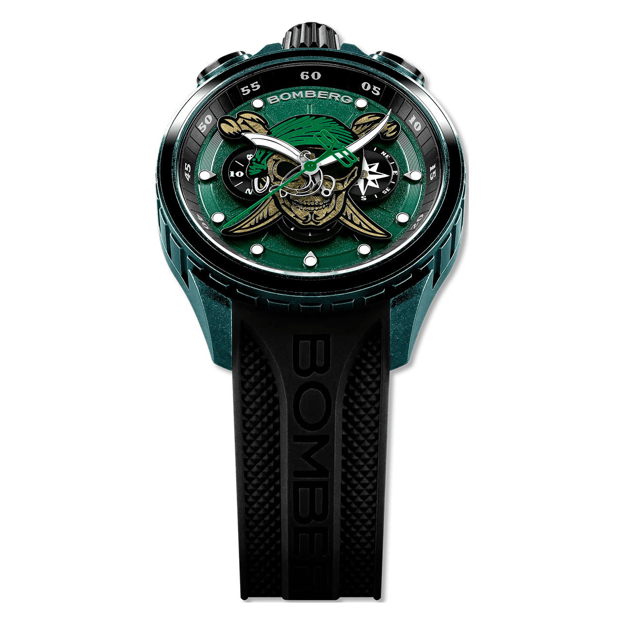 Корпус: Круглый стальной корпус марки 316L, с PVD покрытием синего цвета. Зелёный циферблат, часовые индексы и стрелки из белой латуни с люминесцентным покрытием (Super-LumiNova). На циферблате изображен уникальный рельефный череп. Сапфировое стекло с антибликовым покрытием.