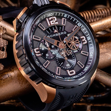 Корпус: Круглый корпус выполнен из нержавеющей стали. Стойкое к царапинам DLC покрытие черного цвета и PVD-покрытие золотом. Черный алюминиевый безель. Черный циферблат «clou de Paris» придает модели текстуру и элегантность. Уникальный дизай с завинчивающейся заводной головкой в положении «12 часов» и кнопками хронографа. Аппликация часовых индексов и стрелки с покрытием Super-Luminova®. Сапфировое стекло с антибликовым покрытием. Диаметр корпуса 45 мм, толщина - 13 мм. Водостойкость 50 метров.