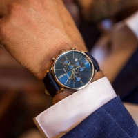 Корпус: Корпус из нержавеющей стали с покрытием PVD. Синий сатинированный циферблат, золотистые стрелки и риски. Сапфировое стекло. Водонепроницаемость 50 метров. Размер 40 мм.