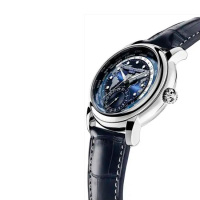 Корпус: Корпус из нержавеющей полированной/матовой стали. Циферблат синего цвета с изображением карты мира. Стрелки часов и индексы чёрного цвета. Сапфировое стекло. Диаметр 42 мм. Водозащита 50 м.