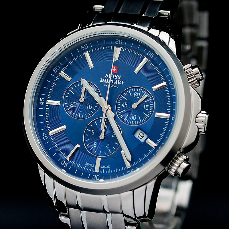 Функции: Индикация часов, минут и секунд при помощи центральных стрелок. Окошко даты. Хронограф.