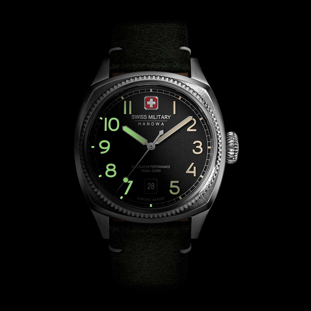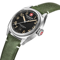 Корпус: Стальной винтажный корпус с шлифованным модифицированным безелем с плоским ребристым краем в виде монеты. Циферблат с пескоструйной отделкой дополнен фирменным логотипом Swiss Military Hanowa. Накладные метки в виде арабских цифр. Заостренные прямоугольные стрелки в стиле Baton. Метки и стрелки с люминесцентным покрытием, которое светится в темноте после непродолжительной зарядки на свету. Сапфировое стекло устойчивое к появлению царапин, обладающее высокой прозрачностью. Рифленая заводная головка в пилотском стиле, украшена фирменным логотипом. Завинчивающаяся задняя крышка. Диаметр 41 мм. Водонепроницаемость 100 м.
