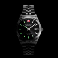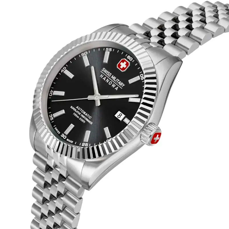 Корпус: Круглый корпус выполнен из нержавеющей стали 316. Рифленый безель. Циферблат чёрного цвета выполнен по технологии Sunray (солнечные лучи) и защищен прочным сапфировым стеклом. Метки в виде штрихов, фирменный логотип Swiss Military Hanowa в положении 12 часов. Стрелки и метки с люминесцентным покрытием, которое светится в темноте после непродолжительной зарядки на свету. Завинчивающаяся задняя крышка с сапфировым стеклом. Рифленая заводная головка украшена фирменным логотипом. Диаметр 41 мм. Водонепроницаемость 100 м.