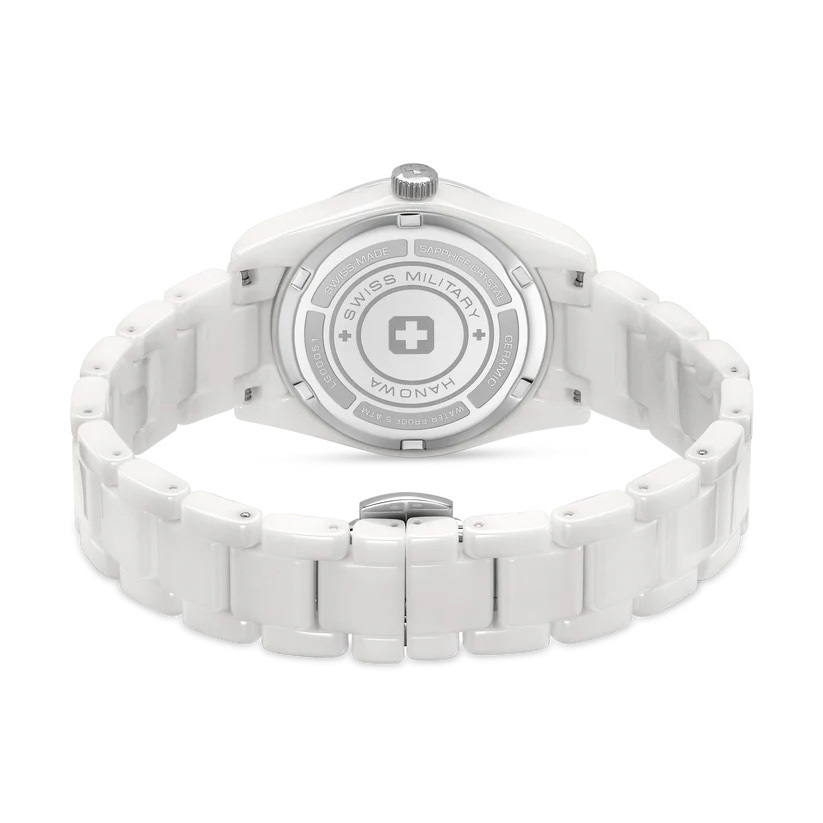 Корпус: Круглый корпус из керамики белого цвета. Белый перламутровый циферблат, украшен тремя искусственными бриллиантами. Стрелки с люминесцентным покрытием, которое светится в темноте после непродолжительной зарядки на свету. Сапфировое стекло устойчивое к появлению царапин, обладающее высокой прозрачностью. Диаметр: 31,5 мм. Водонепроницаемость: 50 м.