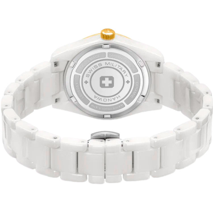 Корпус: Круглый корпус из керамики белого цвета, вставки из стали с IP покрытием. Белый перламутровый циферблат, украшен тремя искусственными бриллиантами. Позолоченные стрелки с люминесцентным покрытием, которое светится в темноте после непродолжительной зарядки на свету. Сапфировое стекло устойчивое к появлению царапин, обладающее высокой прозрачностью. Диаметр: 31,5 мм. Водонепроницаемость: 50 м.