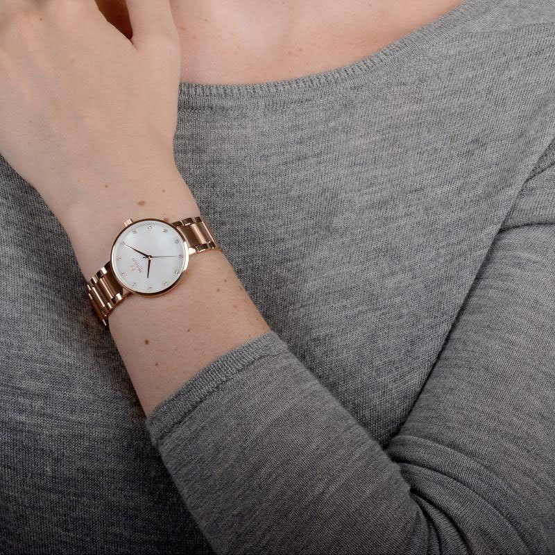 Корпус: Корпус выполнен из стали с розовым IPRG покрытием. Минеральное стекло. Перламутровый циферблат украшен кристаллами Swarovski. Диаметр 34 мм. Водонепроницаемость 30 метров.