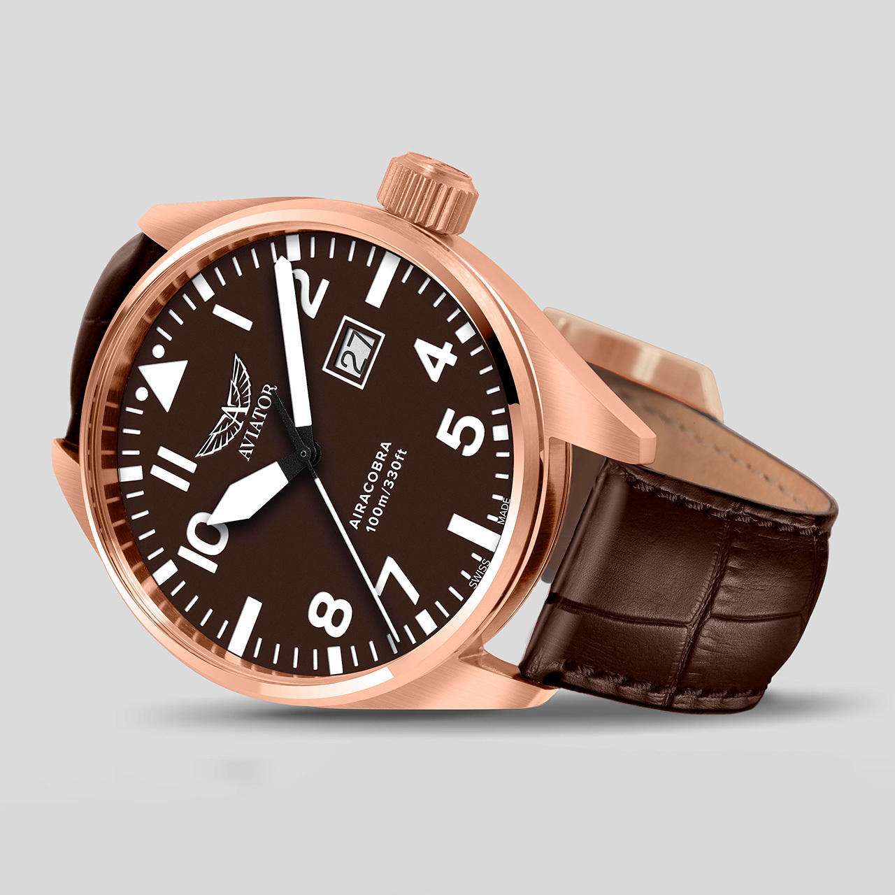 Ремешок: Коричневый ремешок из телячьей кожи с тиснением под аллигатора, ширина 20/18 мм, классическая застежка – пряжка из нержавеющей стали с позолотой.