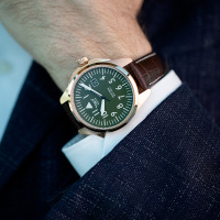 Корпус: Корпус выполнен из высококачественной стали марки 316L с повышенной устойчивостью к коррозии, поверхности с матовой шлифовкой – сатинированием с PVD покрытием. Матовый циферблат с зернистой отделкой имеет окраску зелёного цвета. Контрастные часовые метки и цифры. Стрелки благодаря яркому люминесцентному покрытию SuperLuminova отлично читаются в полнейшей темноте и в условиях слабой освещенности. Сапфировое стекло с двусторонним антибликовым покрытием имеет повышенную устойчивость к возникновению царапин. Переводная коронка с двойным уплотнителем и винтовой фиксацией для дополнительной защиты от попадания воды внутрь корпуса. Задняя крышка имеет резьбовое соединение с корпусом. Диаметр корпуса составляет 42,8мм, толщина 9,95мм. Водостойкость 100 метров (10 АТМ).