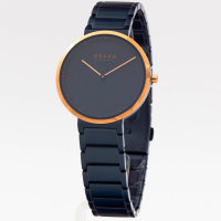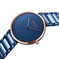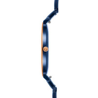 Корпус: Корпус выполнен из нержавеющей стали с IP покрытием цвета розового золота и синего. Синий циферблат. Устойчивое к возникновению царапин сапфировое стекло. Размер корпуса составляет 34 мм. Водостойкость WR 30 (брызги).