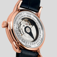 Ремешок: Чёрный ремешок из телячьей кожи с тиснением под аллигатора, ширина 22/18 мм. Браслетная застежка из нержавеющей стали, раскладывающаяся при нажатии кнопок двойной блокировки.